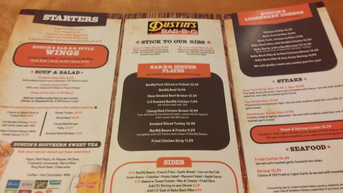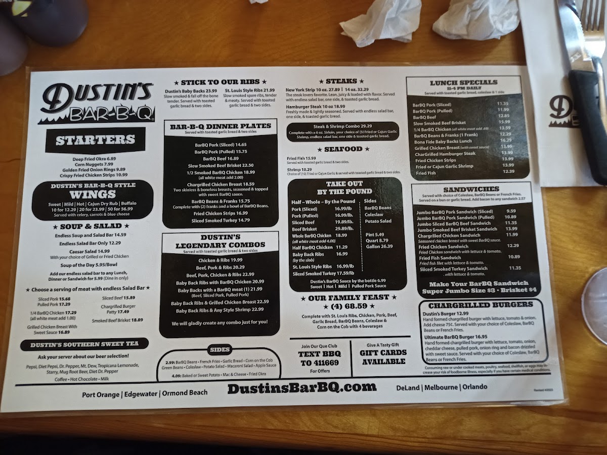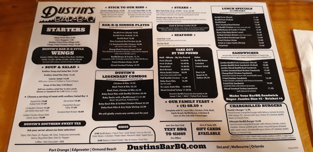 If you're craving authentic, mouthwatering barbecue, look no further than Dustin's Bar-B Q Menu. Located at 1208 S Ridgewood Ave in Edgewater, Florida, this place serves up some of the best smoked meats you'll ever taste. Whether you're in the mood for tender ribs, juicy pulled pork, or a crispy chicken sandwich, Dustin's has got you covered. The menu offers a variety of options that are perfect for every BBQ lover, with a mix of classic favorites and signature dishes that will leave you coming back for more.